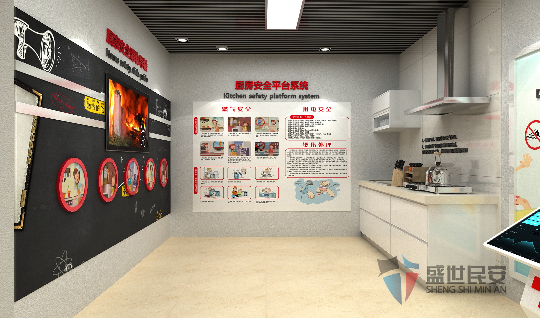 家庭廚房安全學(xué)習(xí)系統(tǒng)模擬現(xiàn)實(shí)廚房場景,設(shè)置六種常見安全隱患點(diǎn):電水壺、點(diǎn)飯煲、油鍋、燃?xì)忾y、燃?xì)庠?、?.....盛世民安 2020-05-04